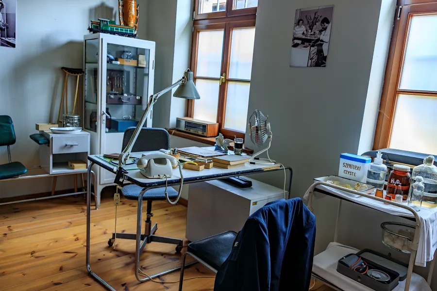 Po krótkim wprowadzeniu ruszamy dalej – do pomieszczeń, które wyglądają tak, jakby ktoś wyszedł z nich dosłownie chwilę temu. Zaglądamy do gabinetów urządzonych w dawnym stylu i od razu czujemy, że cofamy się w czasie.